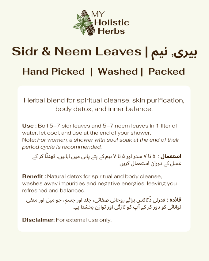 A herbal bath blend crafted with dried sidr and neem leaves, known for their deep cleansing and skin-purifying properties. Traditionally used for detoxification and spiritual renewal